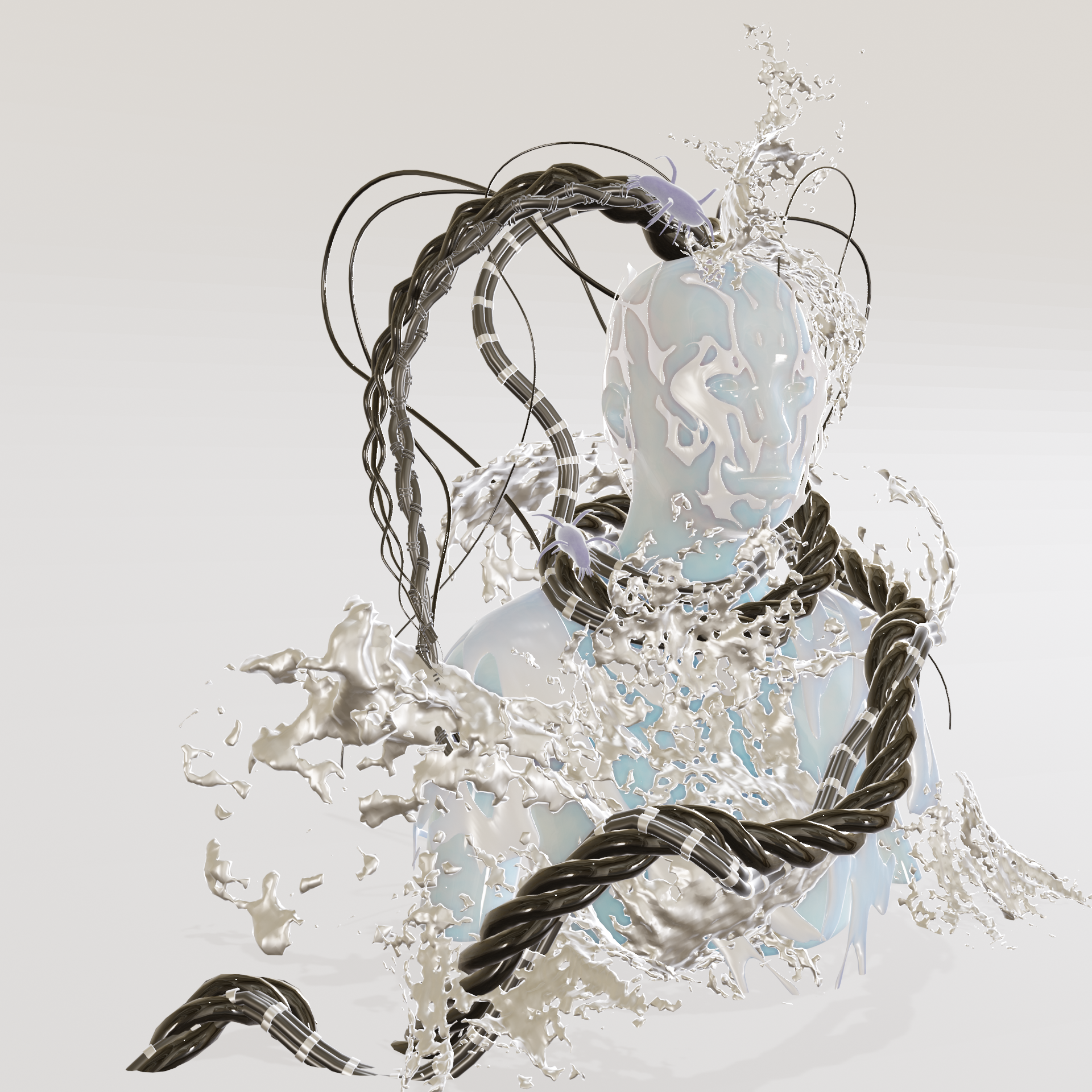 Kai Hai A.A.G. (above and below) is a transpacific deity born from submarine fiber optic cables, and the desire for human connection across the Pacific Ocean. Manifested as a goddexx, A.A.G. is a hybrid of the organic and the inorganic, brought forth from the interconnection of geographies, machines, physical undersea infrastructure, and the deep sea creatures that grow on it’s metal piping. Representing non-linear pathways of communication streams across the ocean, of both histories and future destinations, they can appear in many places and times at once, enabling the flow of the internet across the world. In a dialogue installed on view at epoch.gallery, and at the Gray Area Festival, A.A.G. has brought together two oceanic deities across the Pacific ocean: Mazu 妈祖 (a Chinese sea goddess, spoken by Qianqian Ye) and Hina opuhala ko’a (a Hawaiian goddess of coral reefs, spoken by Tiare Ribeaux). We hear all three in conversation as they confer about the state of humanity and the growth of technology over the past 1000 years. Also on view via the Gray Area Festival Installation of Kai Hai online at: New Art City